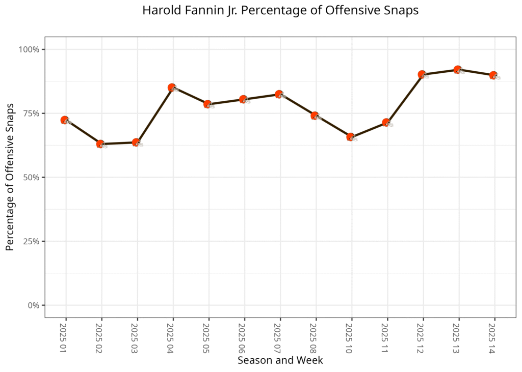 Cleveland continued that plan to start this game, as Fannin played all 10 snaps on the first three drives, while Njoku played six. He suffered the injury while scoring a touchdown. This left Blake Whiteheart as the primary backup tight end over the rest of the game. Fannin played 90% of the snaps over the rest of the game, so the injury didn't really impact him.