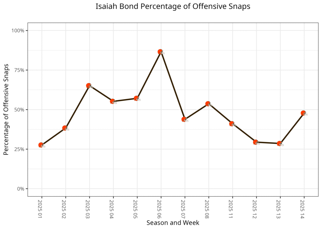 The Browns continued with that rotation over the first three drives, as Corley’s injury occurred on the first play of the second quarter on a two-yard end-around. He was ruled out of the game at the end of the drive. This left both Bond and Larvadain playing more snaps over the rest of the game in two- and three-receiver sets.