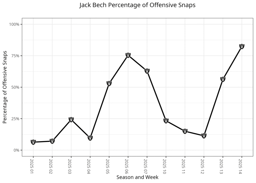 Bech started his career as the Raiders' fourth wide receiver. He briefly took the X receiver role from Dont'e Thornton Jr. but lost the role a few weeks later. It seemed like both wide receivers would see an increased role when the team traded Jakobi Meyers, but Tyler Lockett has largely taken Meyers' spot.