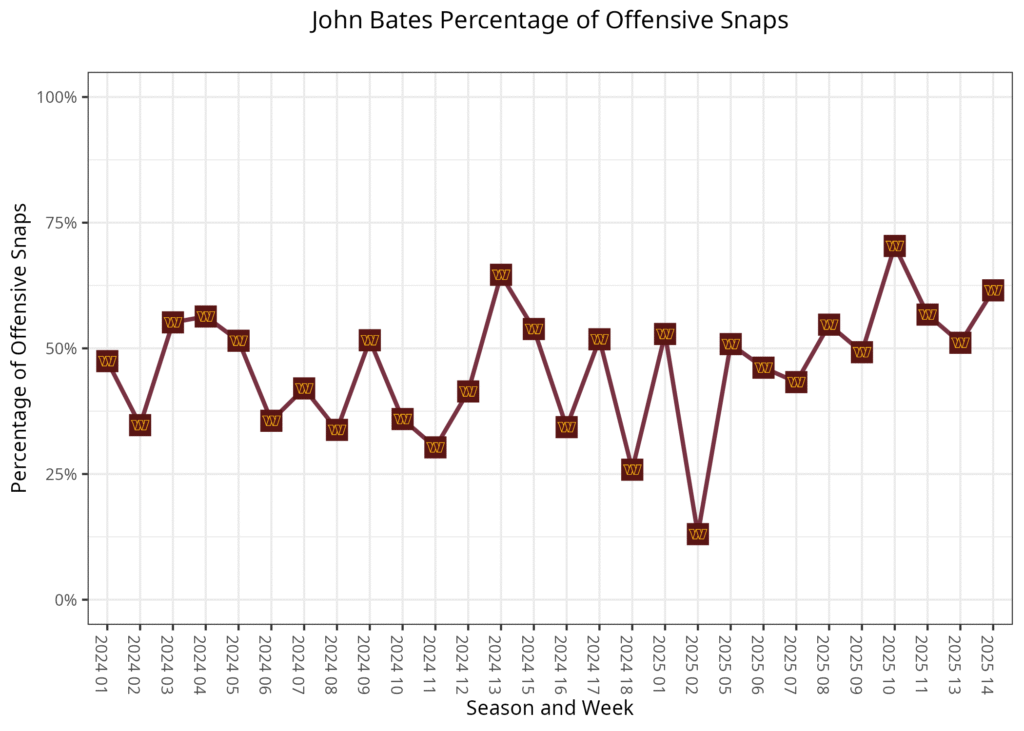 At the start of the season, it seemed like the battle at tight end would be between Jonnu Smith and Pat Freiermuth. Washington was a significant part of that rotation early in the season, playing at least 37% of the offensive snaps each week. He had become an even bigger part of the offense in recent weeks. He played at least 68% each of the last three weeks as the Steelers' primary tight end in 11 personnel each game in both early- and third-down situations.