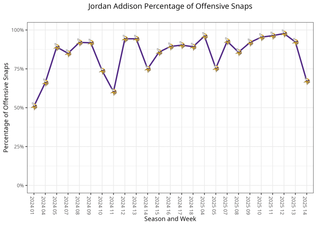 There is at least a chance Thielen can earn more playing time in 11 personnel and gain some chemistry to make him fantasy viable. However, there are only a few weeks left in the fantasy season, so there isn’t much time left for them to gain chemistry and the trust of fantasy managers to put him in fantasy starting lineups.