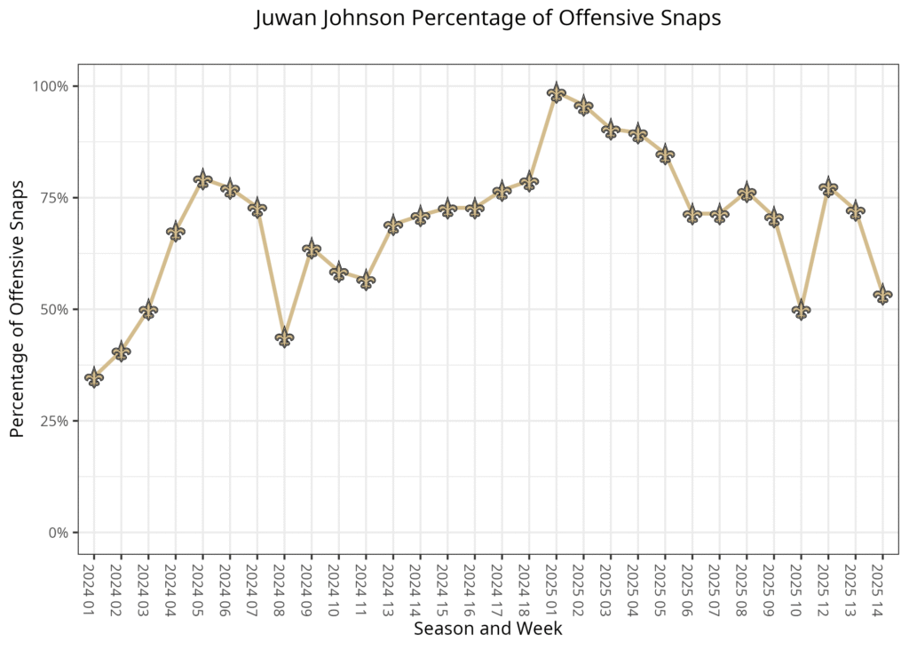The Saints' receiving tight end started the season playing at least 90% of the offensive snaps in each of the first four weeks. His playing time declined once Foster Moreau and Taysom Hill were healthy, but it seemed to stabilize around 70-78% of the offensive snaps each week.