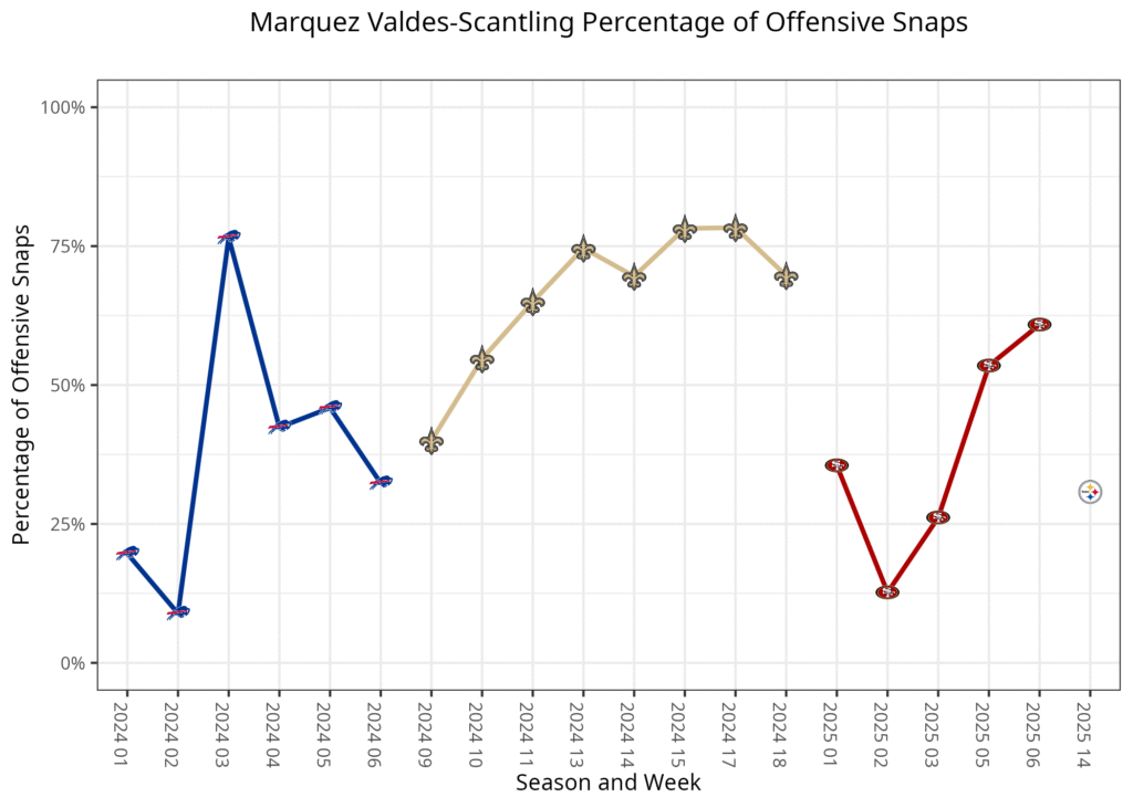 The Steelers have generally used D.K. Metcalf as their X receiver, Calvin Austin III as a Z/slot hybrid, Roman Wilson as their typical third receiver in three-receiver sets at Z, and Ben Skowronek as an occasional slot receiver in three-receiver sets. Scotty Miller and Ke’Shawn Williams have also played at times. Metcalf is the only wide receiver who has seen any kind of consistent production. Austin is the only other wide receiver with double-digit receptions this year.