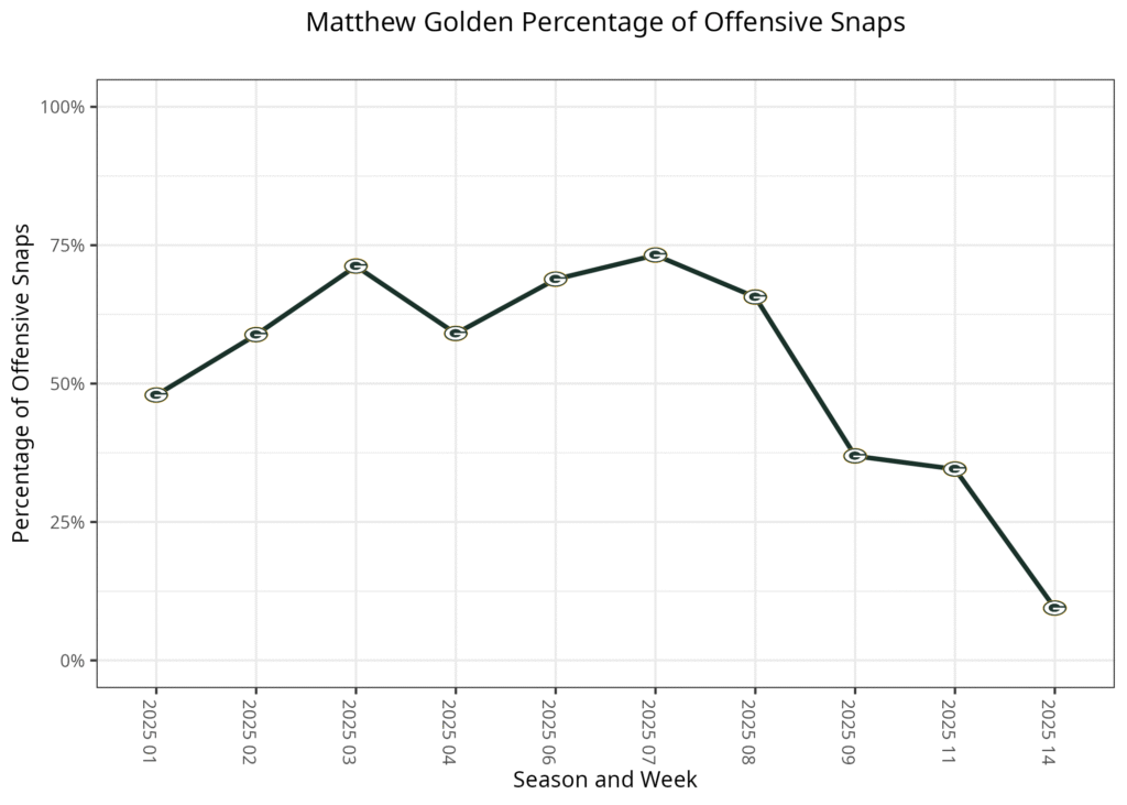 Green Bay started the season with Romeo Doubs as its X receiver, Jayden Reed in the slot, and Dontayvion Wicks and Matthew Golden rotating as its Z receiver, while Christian Watson was still recovering from an ACL tear in January. Reed suffered a foot and shoulder injury in Week 2, leaving to Wicks to move to the slot. Once Watson was back, Golden also moved to the slot, while Wicks and Golden both missed some time due to various injuries. Most recently, Wicks has been playing through an ankle injury, which caused him to be limited in practice this week. Golden missed back-to-back games with a wrist injury, but he was back for this game.