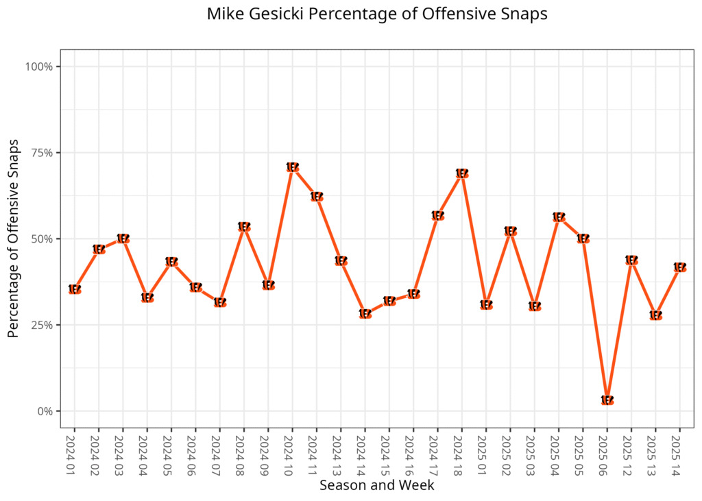 Gesicki was a big part of the Bengals' offense in 2024, finishing seven games with at least 40 receiving yards, which included three games of 85-plus yards. His playing time has decreased a little bit this season, and his production hasn’t been nearly the same. He was held under 20 receiving yards in seven of his first eight games, and four receptions for 35 yards was in his best game.