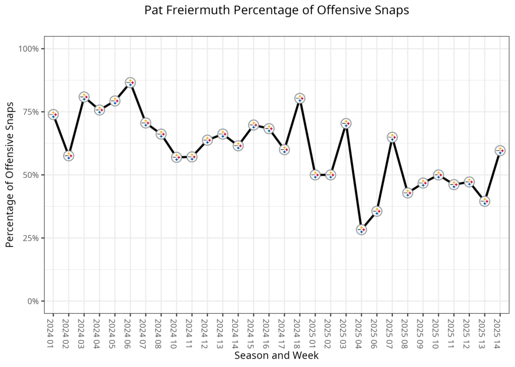 It seemed like his role was going to be even larger in this game, playing a snap on 15 of the first 16 plays. He suffered the injury on a 12-yard reception. This led to notably more playing time for both Freiermuth and Smith over the rest of the game. Freiermuth played 23 of 30 snaps from the fourth drive until the end of the game, while Jonnu Smith played 20 of 30. Freiermuth tended to be used more in passing situations, while Smith played more in running situations. Freiermuth was on the field for 16 of the final 19 passing plays, although he was asked to block on a few of them.
