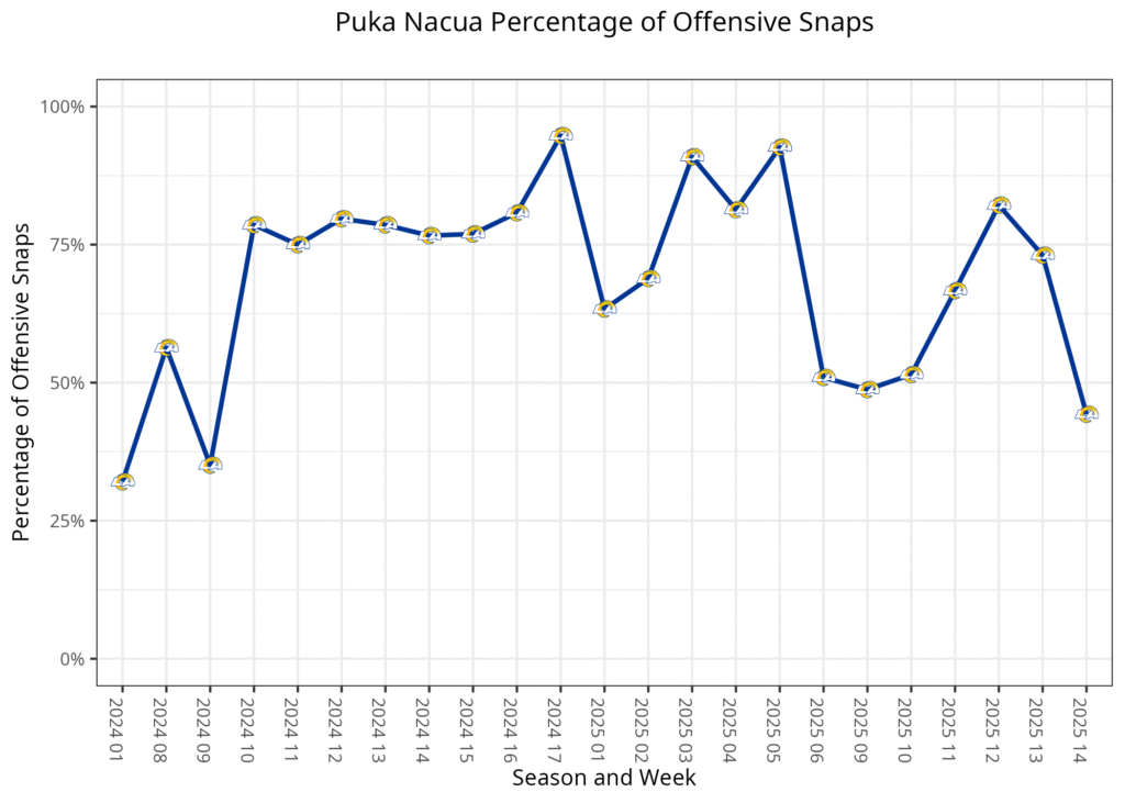 Every Rams wide receiver was held under 50% of offensive snaps: Konata Mumpfield led the wide receivers, with 45.7% of offensive snaps.