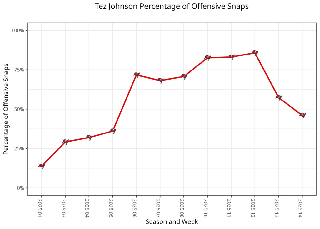 Tampa Bay has utilized a four-man rotation at wide receiver in recent weeks. Emeka Egbuka has been the X receiver, while Chris Godwin has been the Z in two receiver sets, and Godwin played in either Z or the slot in 11 personnel, depending on who else is on the field. Tez Johnson has been a Z receiver when on the field, while Sterling Shepard played in the slot. There have also been several plays without Godwin in 11 personnel.