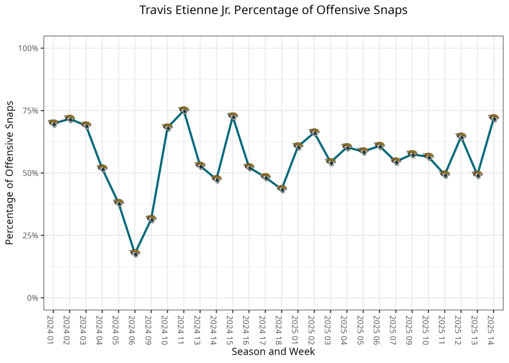 The Jaguars' backfield has been stable for most of the season, as Travis Etienne Jr. has played 59% of the offensive snaps as the main running back, while Tuten played 21% as the backup on early downs, and LeQuint Allen Jr. played 22% as the third-down back and primary two-minute drill back. There hasn’t been much variability in Etienne’s playing time, finishing with 49%-66% of offensive snaps in every game.