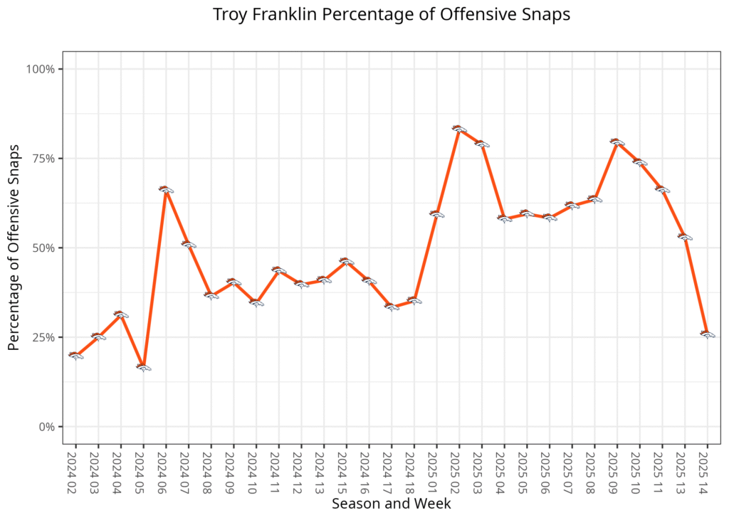 Troy Franklin finishes fifth in snaps for Denver: Franklin remained in a rotation with Marvin Mims Jr., while not playing much in two-receiver sets.