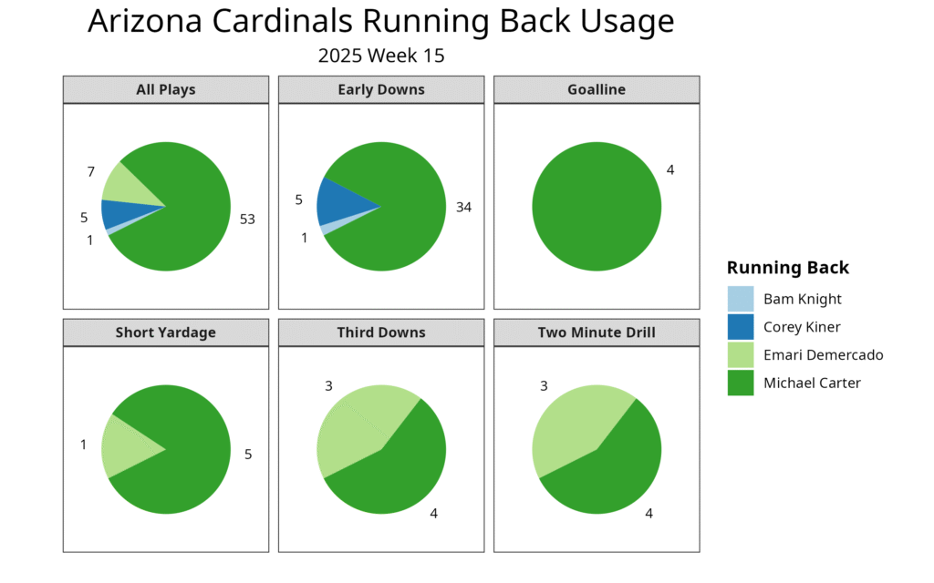 Knight suffered an ankle injury on the very first offensive play for Arizona. While Demercado was back, the Cardinals only trusted him in a limited role. This meant Carter was the every-down back throughout the rest of the game. Demercado mixed in, at times, for third-down snaps.