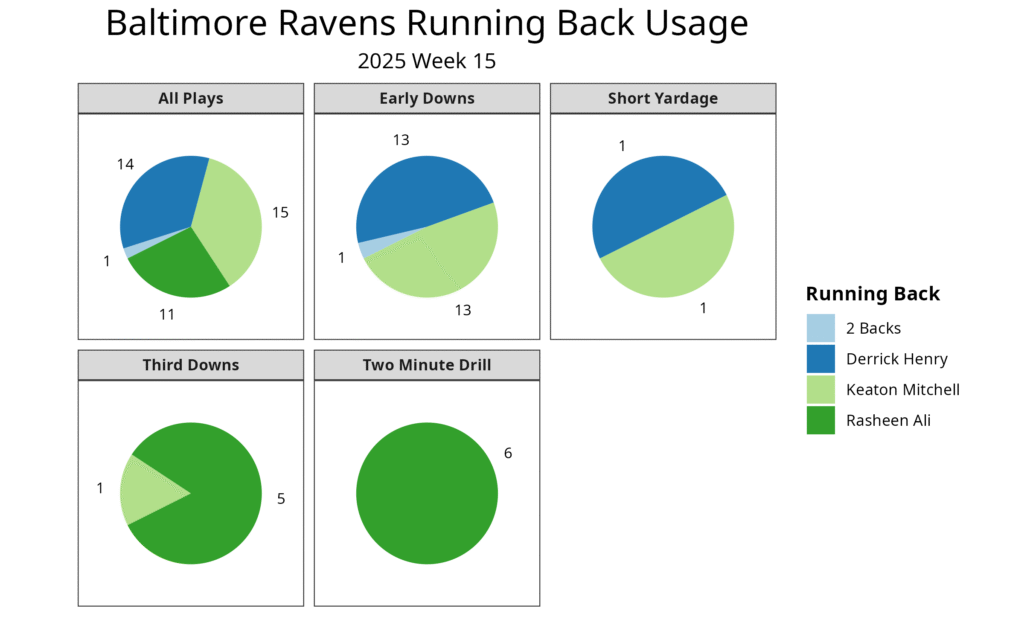 The Ravens started the year with Derrick Henry as their early-down back and Justice Hill as their receiving back, similar to last season. Hill is currently on injured reserve, and Rasheen Ali has taken over as the receiving back. Ali scored the Ravens' first touchdown of the game on a 30-yard reception.