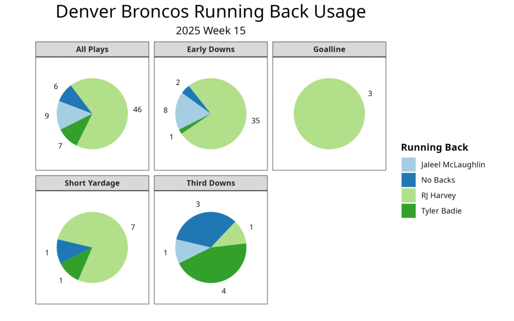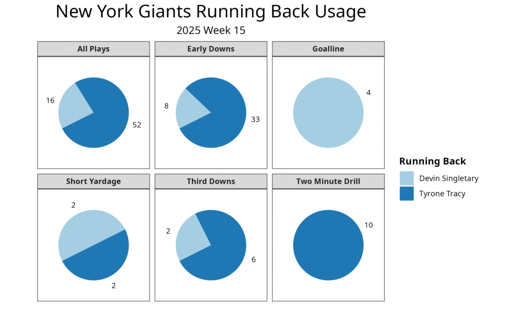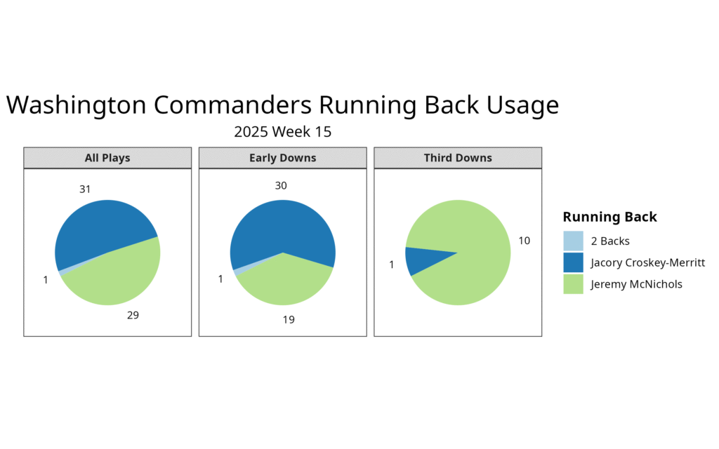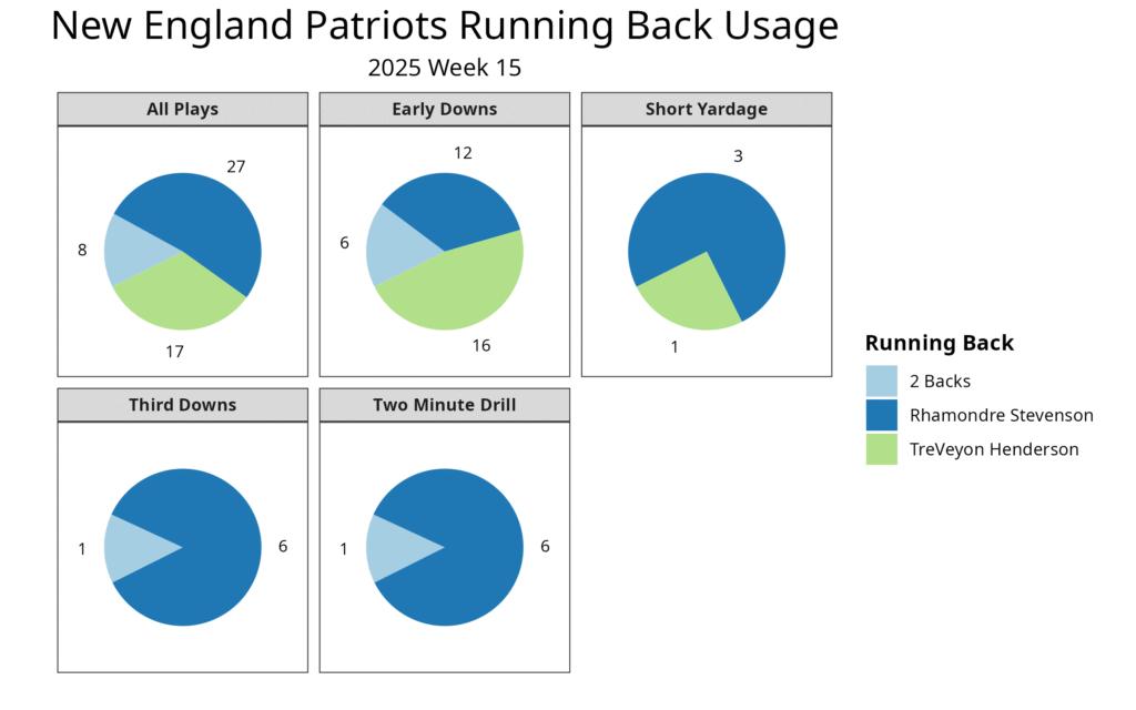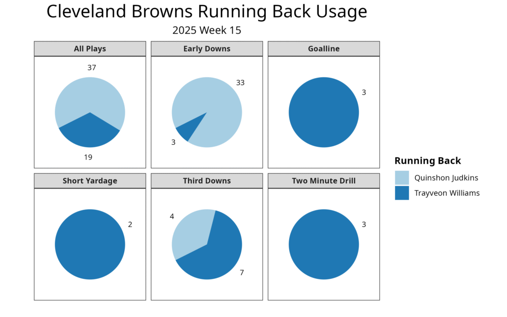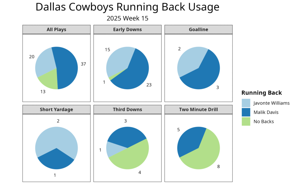 Williams opened the game in his usual role, playing nine of 10 snaps on the first drive and carrying the ball six times. After that, Davis handled most of the work for the remainder of the first half, playing 14 of a possible 26 snaps, including early-down duties, while Luepke handled third downs and two-minute situations. Williams returned in the second half but rotated out more frequently than usual. When Williams was on the field, Dallas almost exclusively ran the ball, while Davis’ snaps skewed heavily toward passing situations.