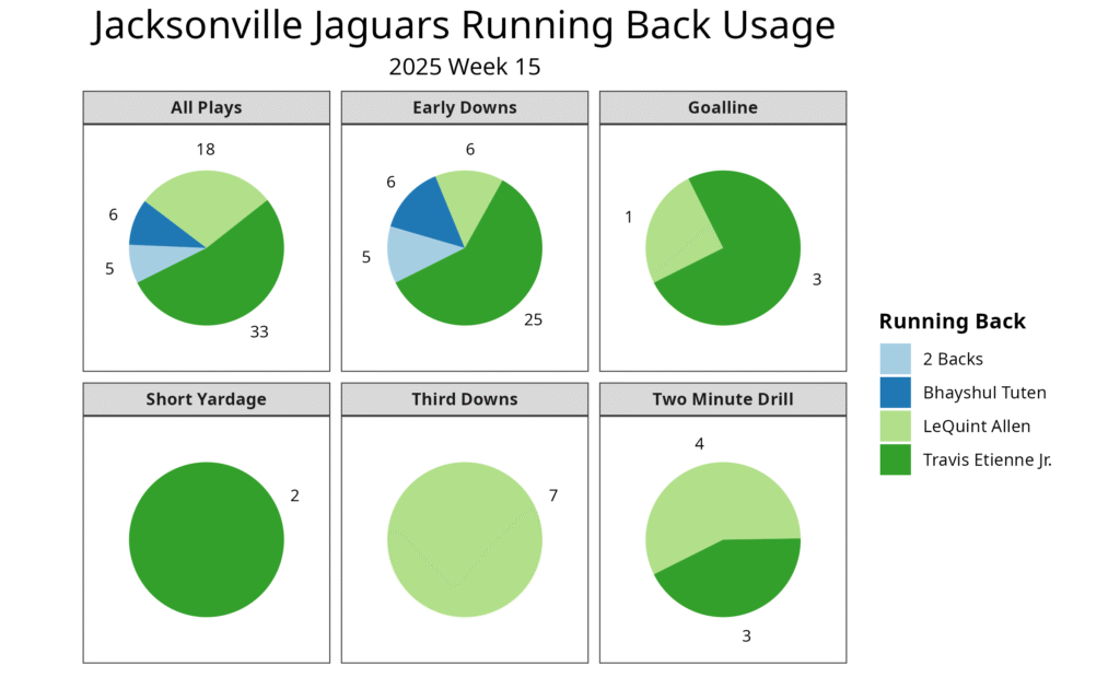 Jacksonville has used Travis Etienne Jr. as its early-down back, Tuten as his backup, and LeQuint Allen Jr. as its receiving back throughout the season. All three have been able to play in every game this season. Tuten fumbled twice last week, leading to him barely playing on offense in that game. All was forgiven this week, as Tuten played 11 of a possible 39 snaps in the first half. His snap rate was a little higher than usual, likely because the Jaguars were running so many plays.