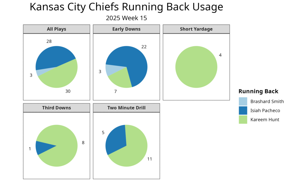 This week, Pacheco was back to his usual role, playing 68.8% of the early-down snaps. Hunt remained the backup, passing-down back and short-yardage back. He ran 11 times for 21 yards, while Hunt ran six times for 12 yards.