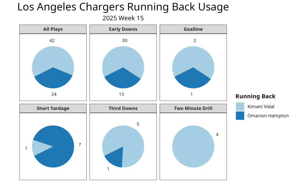 Hampton was the Chargers' primary back for the first five weeks, but he missed Weeks 6-13 due to injury. In that time, Vidal played admirably, leading the two to split snaps in Week 14. It was close to a 50-50 split in the first half, but as the game progressed, the team turned more toward Vidal. The team was clear that it would use both running backs and stick with the hot hand.