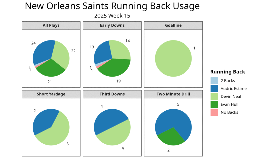 After the injury, New Orleans turned to a two-back committee of Evan Hull and Audric Estime. The two split snaps with 20 each, starting with the fourth drive. Hull was the one more trusted as a runner, totaling four carries for 12 yards. Estime ran three times for 11 yards and was the primary receiving back. New Orleans largely stuck with passing the ball throughout the second half.