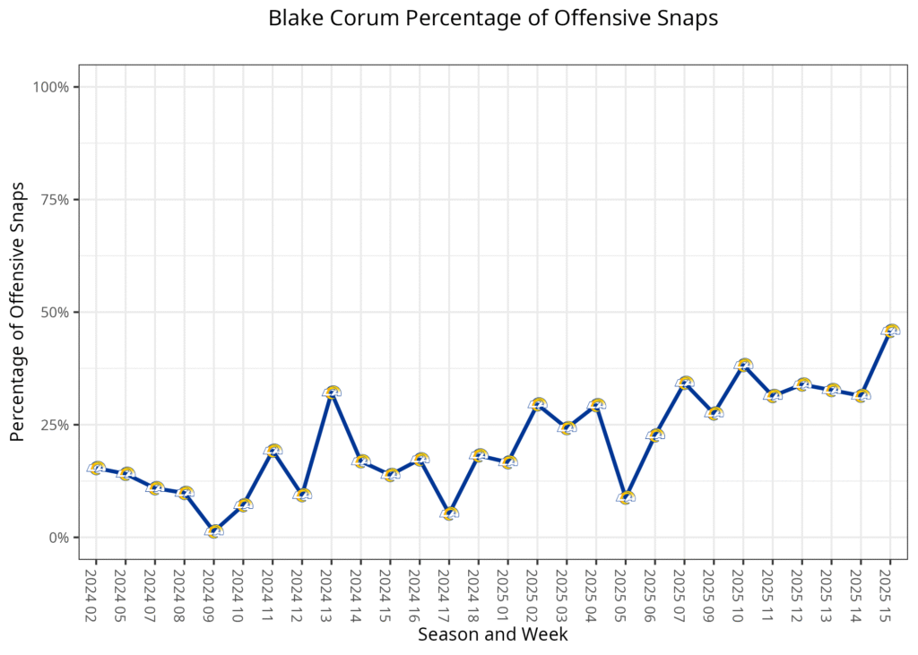 Corum has spent the last two seasons as Kyren Williams‘ backup. Last season, Corum would usually take one or two drives from Williams to give him a break. Los Angeles continued that this season, but that one or two drives turned into three or four early in the season. Corum has played very well at times this season, which has led Los Angeles to embrace a rotation by drive. In recent weeks, Los Angeles was fine giving Williams the final drive of the first half and first drive of the second half or straying from the rotation late in games to switch in Williams.