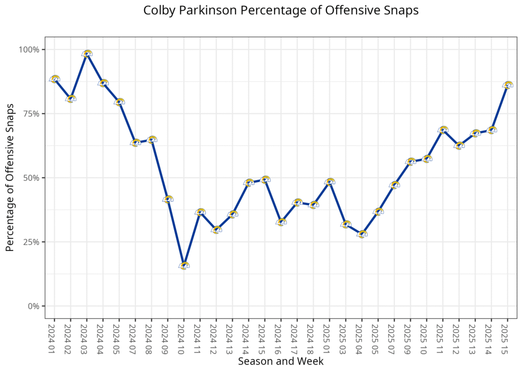 Parkinson played all 46 of the 13 personnel snaps, all eight in 12 personnel and eight of the 10 in 11 personnel on early downs. The only time he was off the field was when the Rams used 11 personnel on third downs, which belonged to Ferguson. Parkinson was slowly but surely becoming a more intriguing fantasy option, scoring four touchdowns in the last five weeks. However, he has been held to four receptions or fewer and less than 50 receiving yards in every game this season.