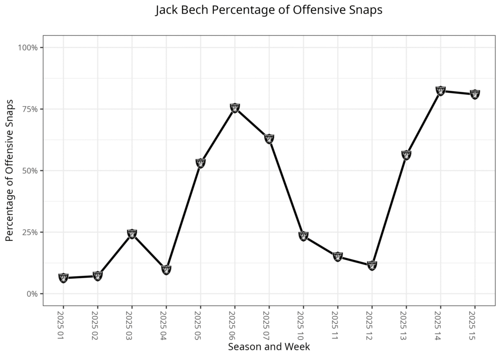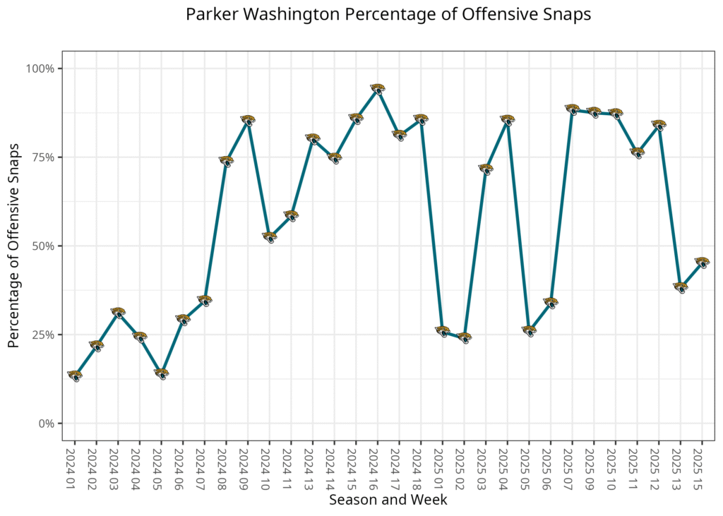 Washington has been a top-three wide receiver, when healthy, most of this season. Most recently, he and Jakobi Meyers were the primary wide receivers, while Brian Thomas Jr. joined them in three-receiver sets. Last week, Thomas was back to being an every-down receiver, while Tim Patrick moved from the backup X spot to Washington’s spot as a Z and slot receiver. Patrick had his best game in several years with five receptions for 78 yards and a touchdown.