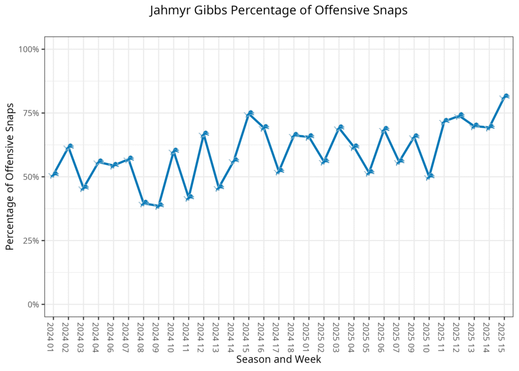 Jahmyr Gibbs reached a season-high in snaps: Gibbs played over 80% of the offensive snaps, and David Montgomery played under 20% for the first time this season.