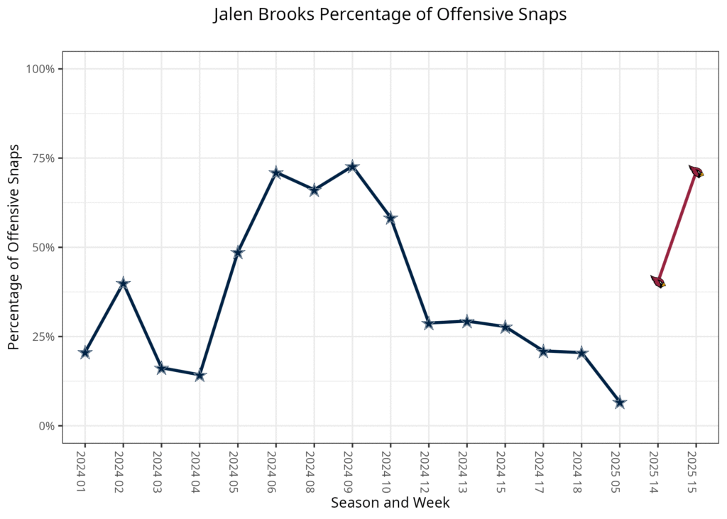 After Baccellia’s injury, Brooks took over as the second wide receiver, while Sherfield took over in 11 personnel. While the Cardinals were down multiple scores, they began using 12 personnel more frequently, despite the game script.