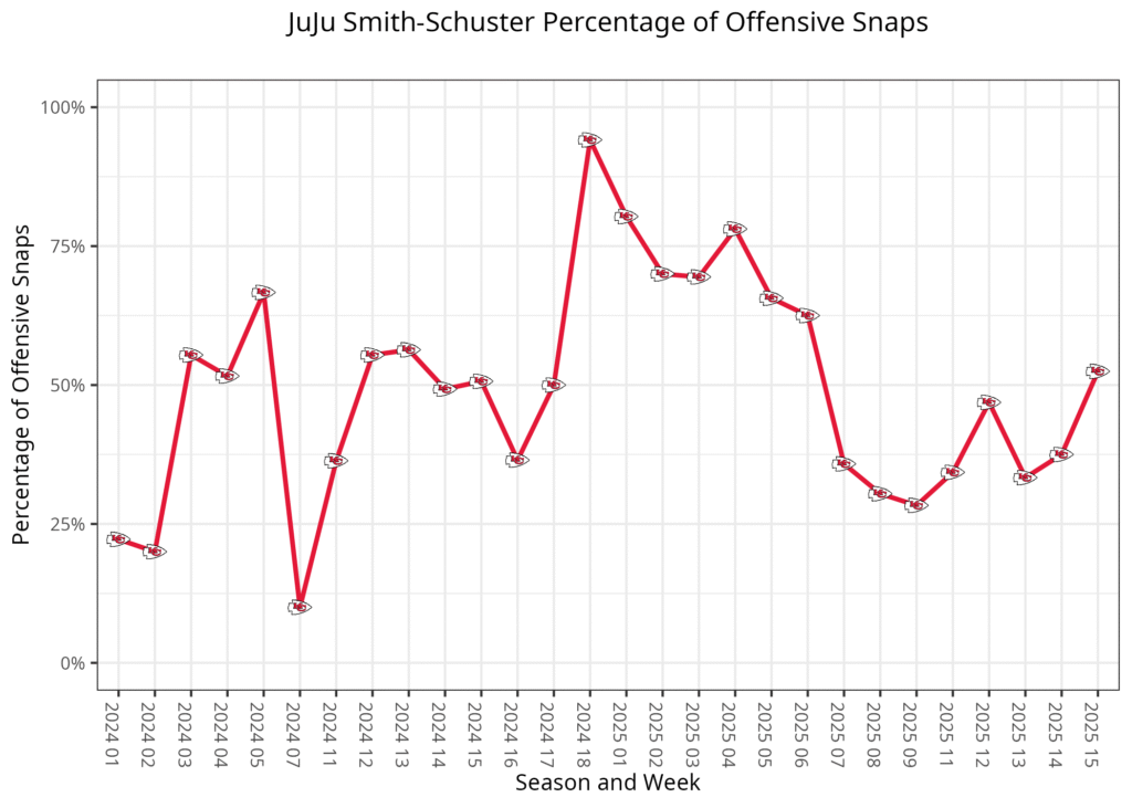 Brown has been third on Kansas City’s depth chart since Rashee Rice’s suspension ended in Week 7. Brown has played 38.3% of the offensive snaps, including 53.8% in 11 personnel, while JuJu Smith-Schuster has been the primary backup in 12 personnel as well as a frequent contributor in 11 personnel. Tyquan Thornton has also played 24.1% of the offensive snaps. Kansas City had each of its top five wide receivers from Weeks 7-14. Fourth-round rookie Jalen Royals had been a healthy inactive throughout most of that stretch, but he was active for this game with Brown out.