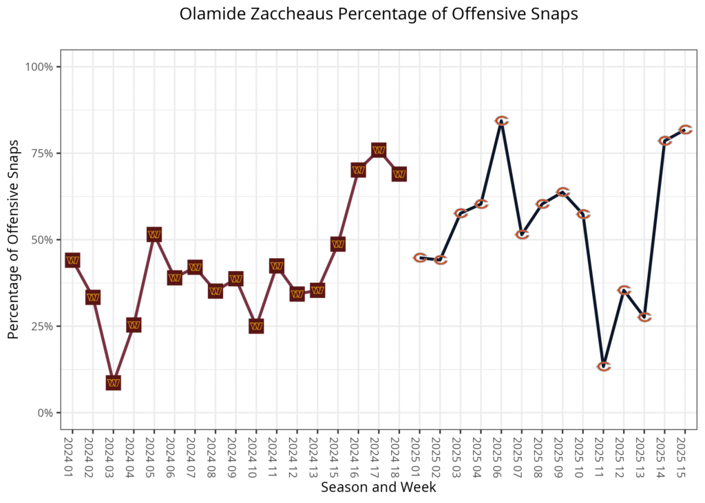 Chicago has spent this season with Odunze and D.J. Moore as their starters. Olamide Zaccheaus started the year as their slot receiver in 11 personnel, but second-round rookie Luther Burden III has largely taken over that role in recent weeks. Last week, with Odunze out, Zacceaus primarily took over in terms of playing time, as Burden also played more snaps. Burden led the team in receiving yards. Burden has been the Bears' top receiver in terms of receiving production over the second half of the season. Backup wide receiver Jahdae Walker was active last week with Odunze out, but he was back to being inactive this week with Odunze active.