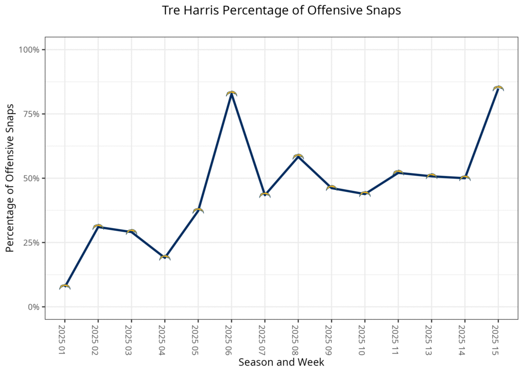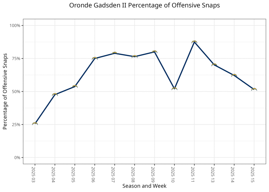 Williams has been Dallas’ clear lead running back for most of the season. From Weeks 11–14, he played between 77% and 80% of the Cowboys’ offensive snaps each week, totaling 231 snaps over that stretch — the most by any running back in the league. Malik Davis has served as his primary backup with Miles Sanders on injured reserve, while Jaydon Blue has remained a healthy inactive. Fullback Hunter Luepke’s ability to play halfback has allowed Dallas to remain comfortable carrying just two running backs on game day.