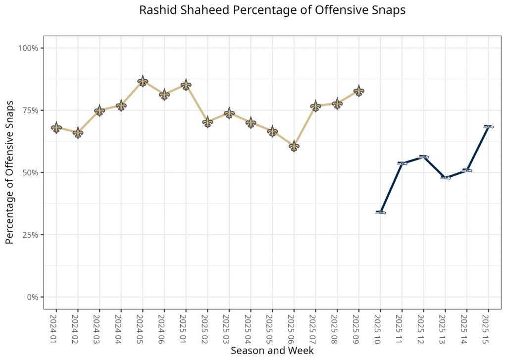 Shaheed was traded to the Seattle Seahawks between Weeks 9 and 10. His role was limited in his first game with the team, but it stabilized from Weeks 11-14. He played 84.3% of the 11-personnel snaps but only 20% of the 12- and 21-personnel snaps, while Jaxon Smith-Njigba and Cooper Kupp were the primary wide receivers in that grouping.