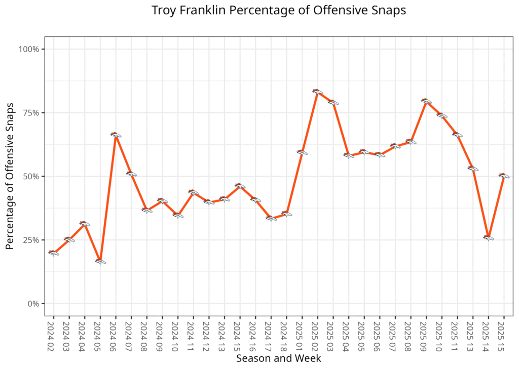 While Tillman and Corley were active, neither played as much as usual. Tillman only played six snaps, while Corley played 14, primarily in 12 personnel. Jerry Jeudy was the X receiver, as usual, but Bond played more than usual in the slot, while Gage Larvadain stepped up as the Z receiver.