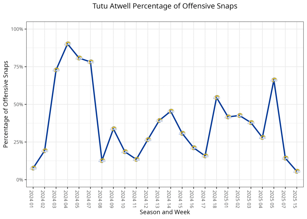 Adams was playing his usual role over the first three quarters, joining Puka Nacua in both two- and three-receiver sets. Konata Mumpfield surprisingly joined them in three-receiver sets. Mumpfield has played significantly since Week 7, when the Rams started embracing 13 personnel, but most of his snaps came from that personnel grouping. This was the first week he played over 40% of the 11-personnel snaps; and he played two-thirds of them. This meant there was little room for Atwell, Jordan Whittington and Xavier Smith on offense. While Mumpfield played more in 11 personnel, he played less than usual in 13 personnel, allowing Nacus and Adams to play more in that personnel grouping.