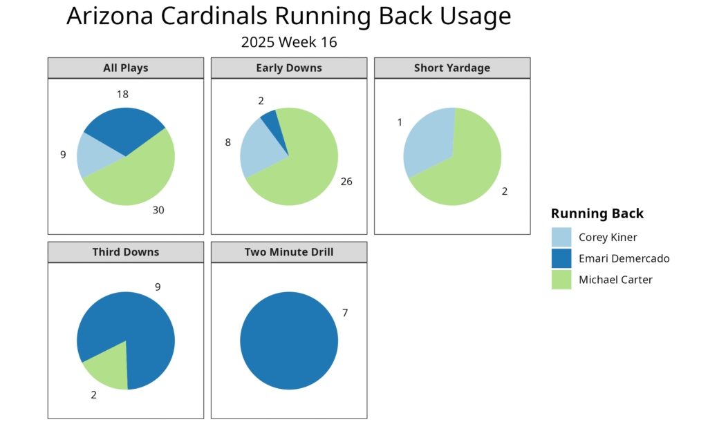 Carter was the lead back, to no surprise. Demercado played a limited role last week, but he was back to playing in all of the clear passing situations this week. Kiner was Carter’s backup, taking a few snaps throughout the game. All three running backs averaged over 5.0 yards per carry on their attempts, but none of the backs scored a touchdown or had a reception.