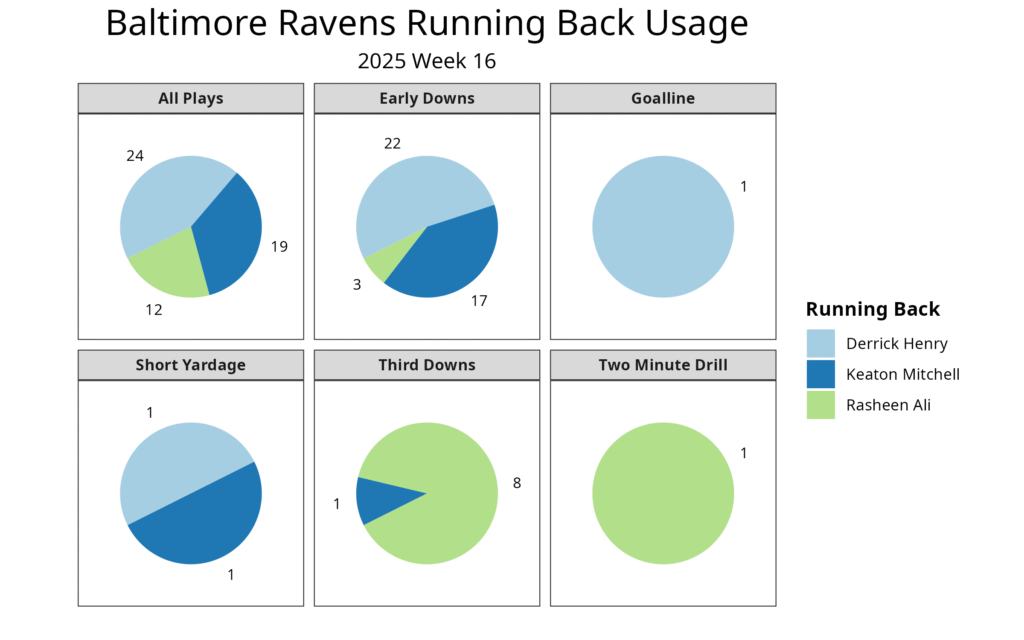 Baltimore continues their three-man rotation at running back: Derrick Henry was held under 60% of the early-down snaps for the fourth time in five games.