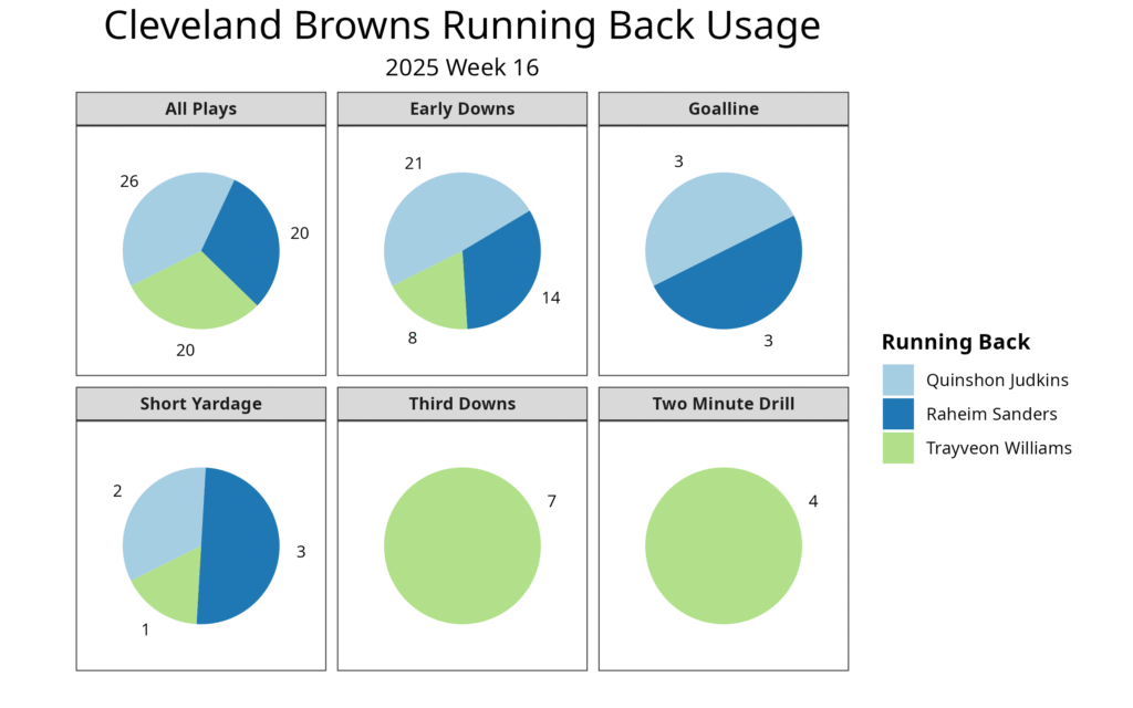 The injuries led Judkins to have a dominant role to begin the game, playing 26 of the first 30 snaps. Trayveon Williams took the third-and-long snaps, while Raheim Sanders was Judkins' backup on early downs. Judkins suffered a leg injury right before halftime. Ian Rapoport reported that Judkins had a broken leg but was also being evaluated for a knee injury. There is some question about whether Judkins will be ready for the start of next season, given how the injury looked.