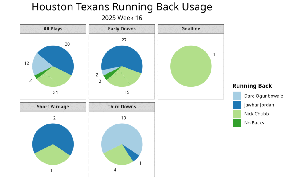 Houston turned to a three-man backfield, led by Jordan. He ran 15 times for 53 yards and caught five passes for 17 yards. Chubb was the backup with six carries for 33 yards, and most of his production came from a 30-yard carry. Dare Ogunbowale has been the Texans' third-down back, at times, this season, although not as much over the second half of the year since Marks emerged as the starter. Ogunobwale was the third-down back for this game.
