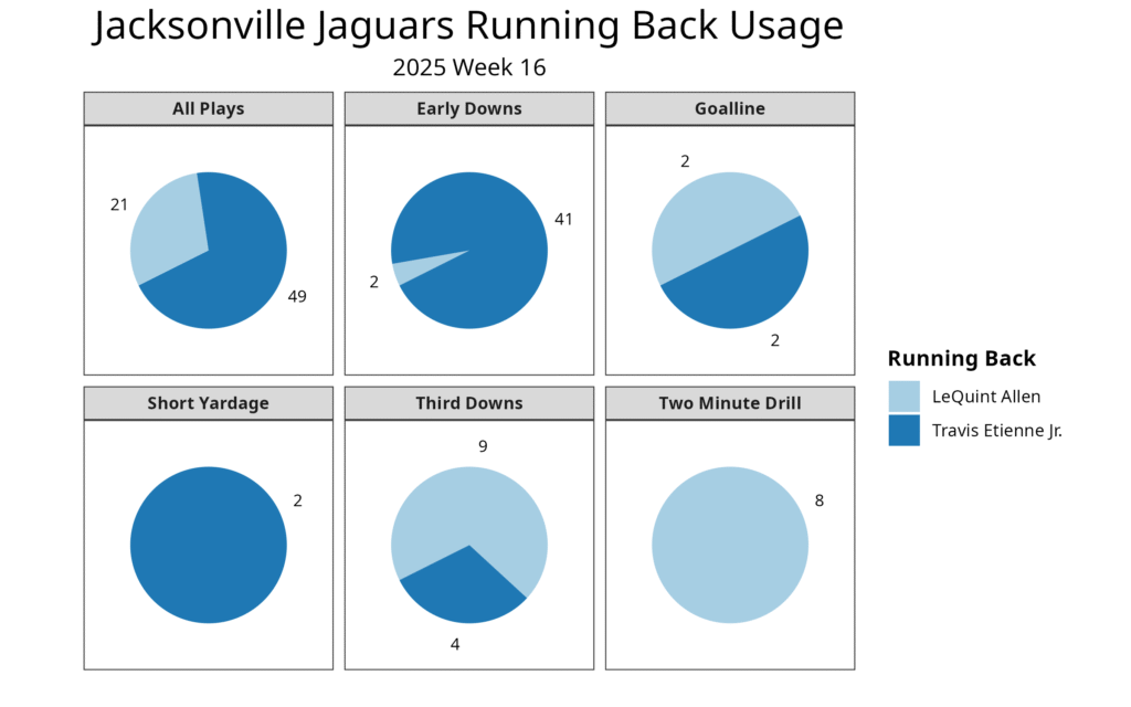 Etienne largely absorbed Tuten’s work. He played 95.3% of the early-down snaps, 100% of the short-yardage snaps, while he and Allen split the goal-line snaps. Etienne ran 16 times for 50 yards and caught four passes for 16 yards and a touchdown. Most running backs have been ineffective against the Broncos' defense, so this was a good game for Etienne, considering the opponent.