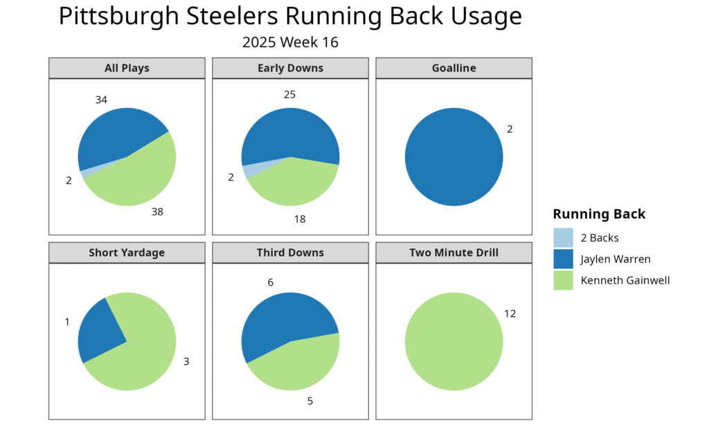 Warren and Gainwell have been the Steelers' top two running backs throughout the season. Warren has played 52.6% of the offensive snaps in games that he’s played, while Gainwell has played 47.3%. For most of the season, Warren has been the early-down back, similar to Najee Harris in recent seasons, while Gainwell has been the passing-down back and backup, similar to Warren in previous seasons.