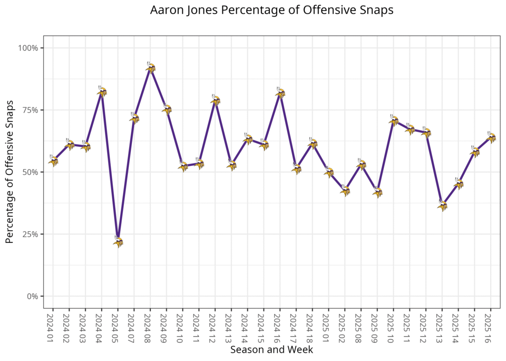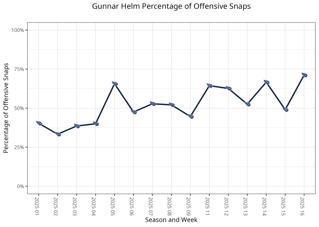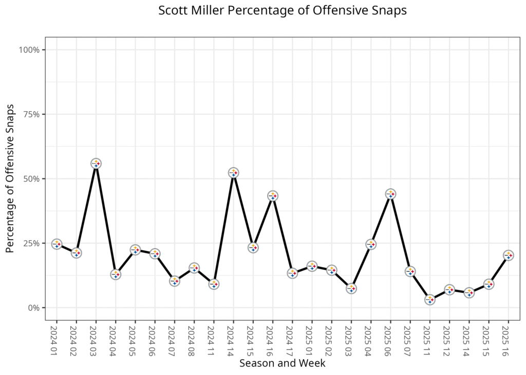 For the second straight week, the roles of the two running backs have been blurred. Warren’s snap rate has fallen to 53.3% of the early-down snaps after consistently playing over 60%, but his snap rate on third downs has increased to 52.4% after consistently playing less than 25% of snaps in those situations. Gainwell played more this week because he took on the two-minute drill snaps, as he’s done most of the season.