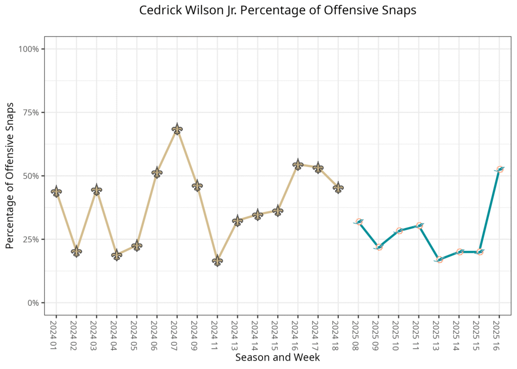 Miami has spent the second half of the season with Jaylen Waddle as the team's top wide receiver, playing 84.1% of the offensive snaps from Weeks 10-15. Malik Washington was second at 53%, playing 96% of the 11-personnel snaps but only half of the snaps in two-receiver sets. Nick Westbrook-Ikhine was the typical third receiver in 11 personnel, while Cedrick Wilson Jr. and Eskridge were the top backups.
