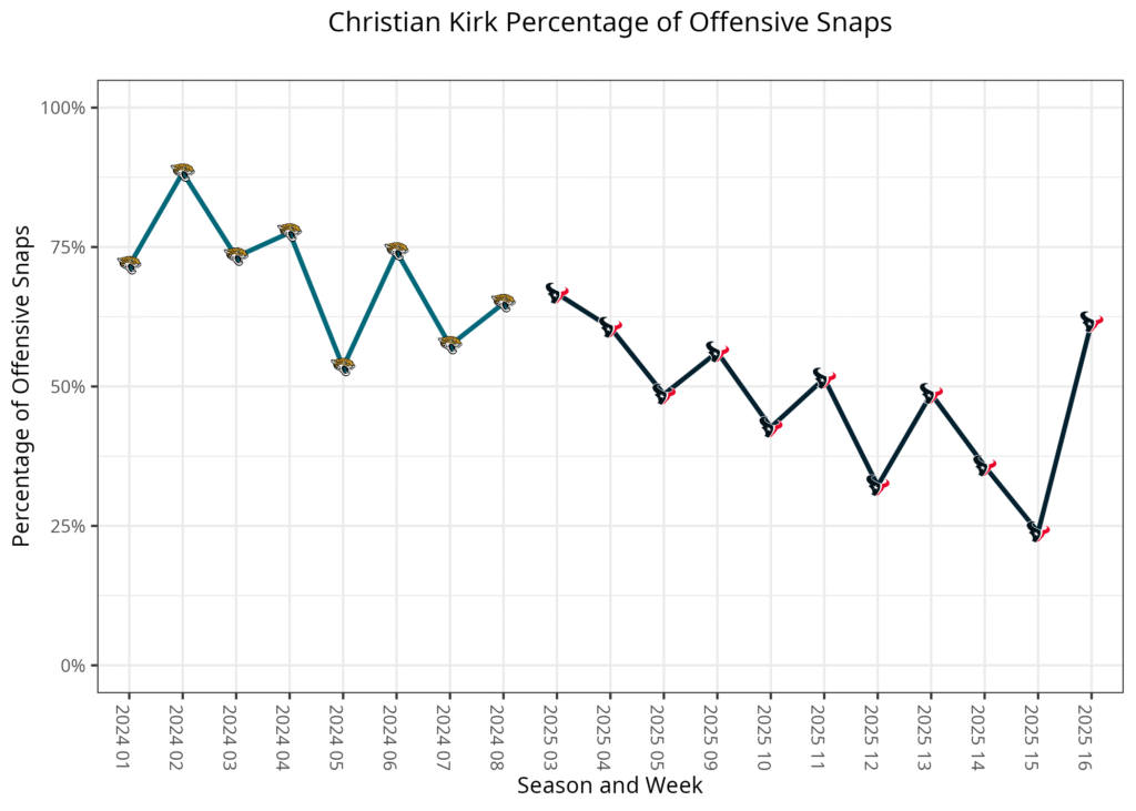 Kirk missed the first two weeks of the season but played 75.5% of the Texans’ 11 personnel snaps in his first three games back from injury. Jayden Higgins had already emerged as Houston’s second option in 12 personnel, so it was going to be hard to trust Kirk in fantasy leagues, given the lack of snaps in two-receiver sets.