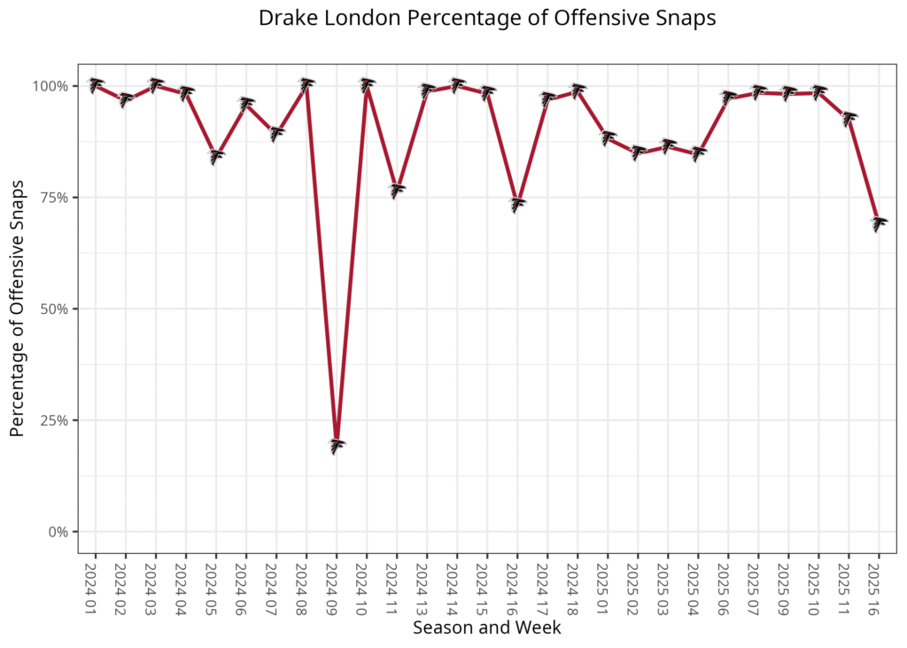 London’s overall snap rate was lower than usual because the Falcons have joined the growing trend of teams using one-receiver sets. Atlanta ran 12 plays out of 13 personnel and one play out of 22. Most teams have a specific wide receiver who would play in these personnel groupings, but Atlanta distributed snaps to all three of its top receivers.