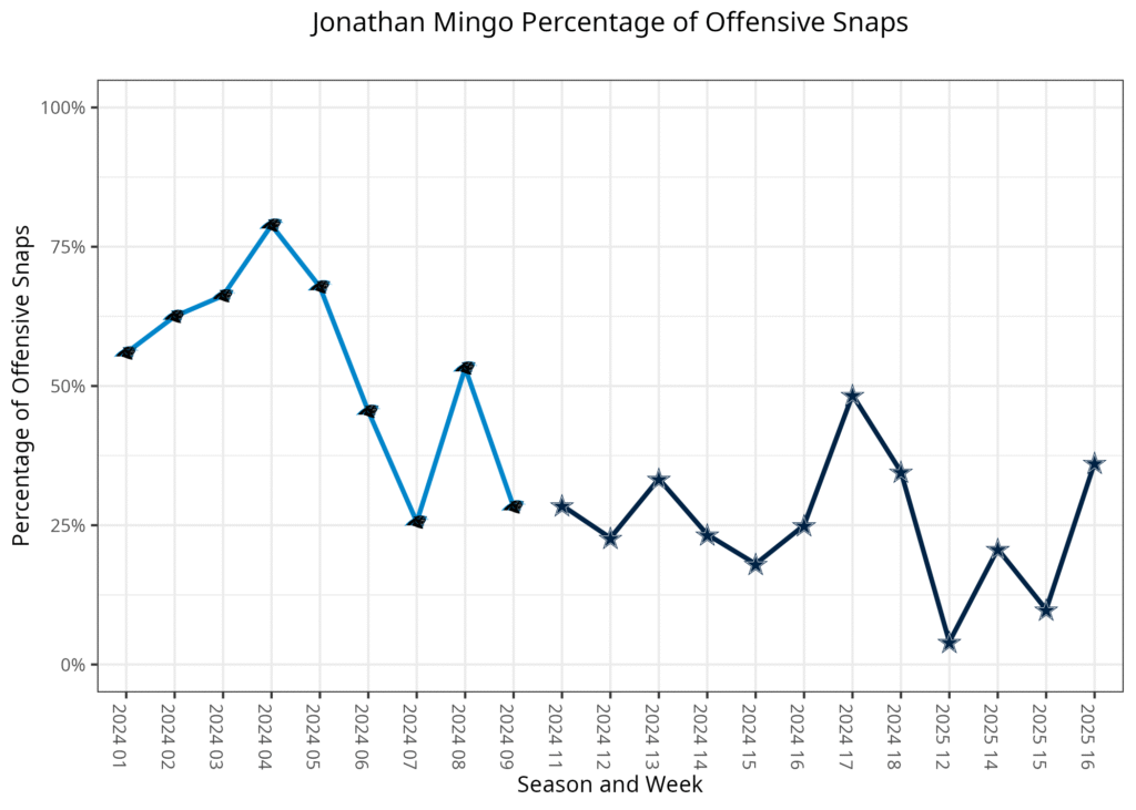 He was ruled questionable in the middle of the second quarter and ruled out after halftime. Dallas continued to use 11 personnel at a high rate after Flournoy’s injury. Jonathan Mingo was Flournoy's primary replacement. Mingo played 16 of a possible 27 snaps over the rest of the game while Dak Prescott was still in the game. KaVontae Turpin only played nine snaps in that time.