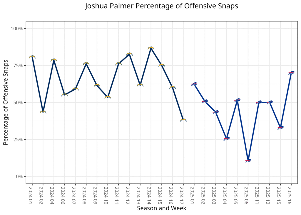 The Bills stopped having as much rotation as usual, as Palmer and Shavers played 80% and 70% of the offensive snaps, respectively, in two-receiver sets, while Palmer, Shavers and Shakir all played at least 80% in 11 personnel. While Palmer has spent most of the season as a Z receiver, he has experience at all three receiver spots during his time with the Los Angeles Chargers. This week, he was the primary X receiver for the team, so Palmer replaced both Coleman and Davis.