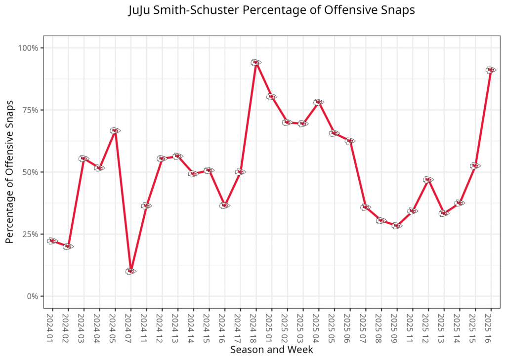 - Running back Ashton Jeanty played 92.6% of the Raiders' offensive snaps, the second-highest rate of his career.