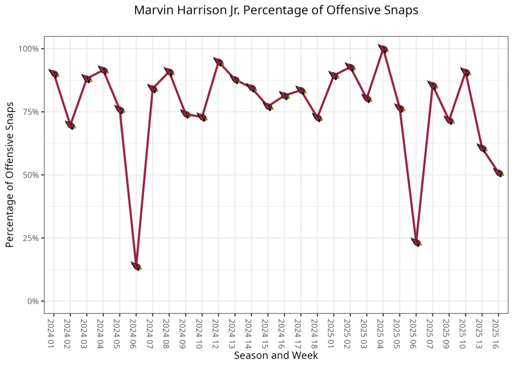 Wilson played notably fewer snaps as the Cardinals’ X receiver with Harrison back. Wilson played 18.0% of snaps on the outside and on the line of scrimmage over the first 11 weeks, as he mostly split snaps as a Z receiver and in the slot. That rate jumped up to 53.7% over the last five weeks, as Harrison missed most of that time. He played notably less in the slot, which helped his fantasy production. This week, he played 38.8% of his snaps on the line of scrimmage as an outside receiver, which was directly in between what he did early in the season and what he’s done recently. He caught two passes for 52 yards and a touchdown, which was fine for fantasy purposes, but it will be harder to trust Wilson going forward in this role.
