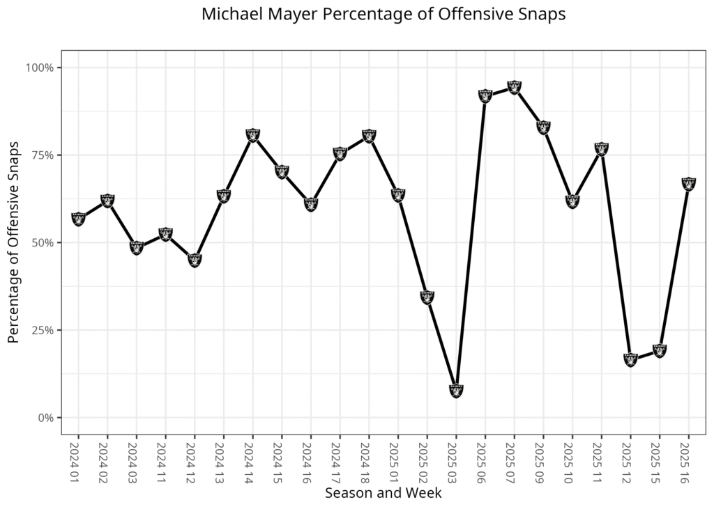 The Raiders only used two- or three-receiver sets on 26 plays in Week 1. The next time they were both healthy was Weeks 11-12, where they ran 73 plays out of 12 personnel and 25 of out of 13. This week, with both tight ends healthy again, they ran 31 plays out of 12 personnel and four out of 13. This left Bowers playing all but one snap, while Mayer played two-thirds of the snaps.