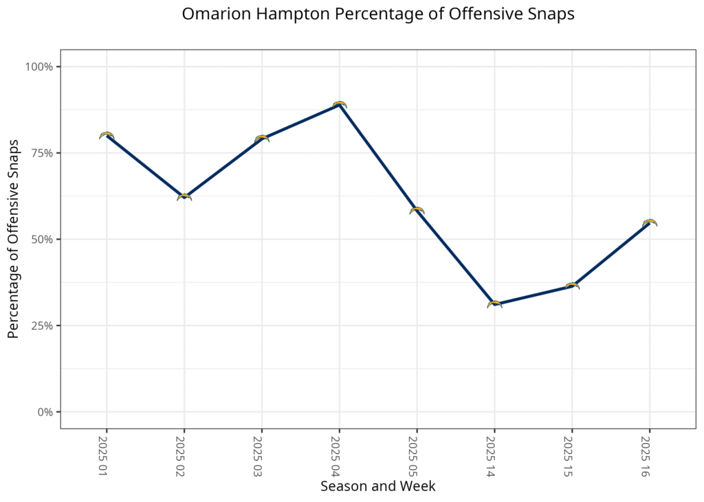 Los Angeles started the season with Omarion Hampton, Najee Harris and Hassan Haskins as its running backs. With all of them injured, Vidal took over as the lead running back for the middle of the season, and he played well enough to earn a split role with Hampton since he returned. Vidal played two-thirds of the snaps over the last two weeks compared to Hampton's one-third. Hampton’s snaps often led to Hampton touching the ball, leading their stat lines to be much closer than the stats suggested.
