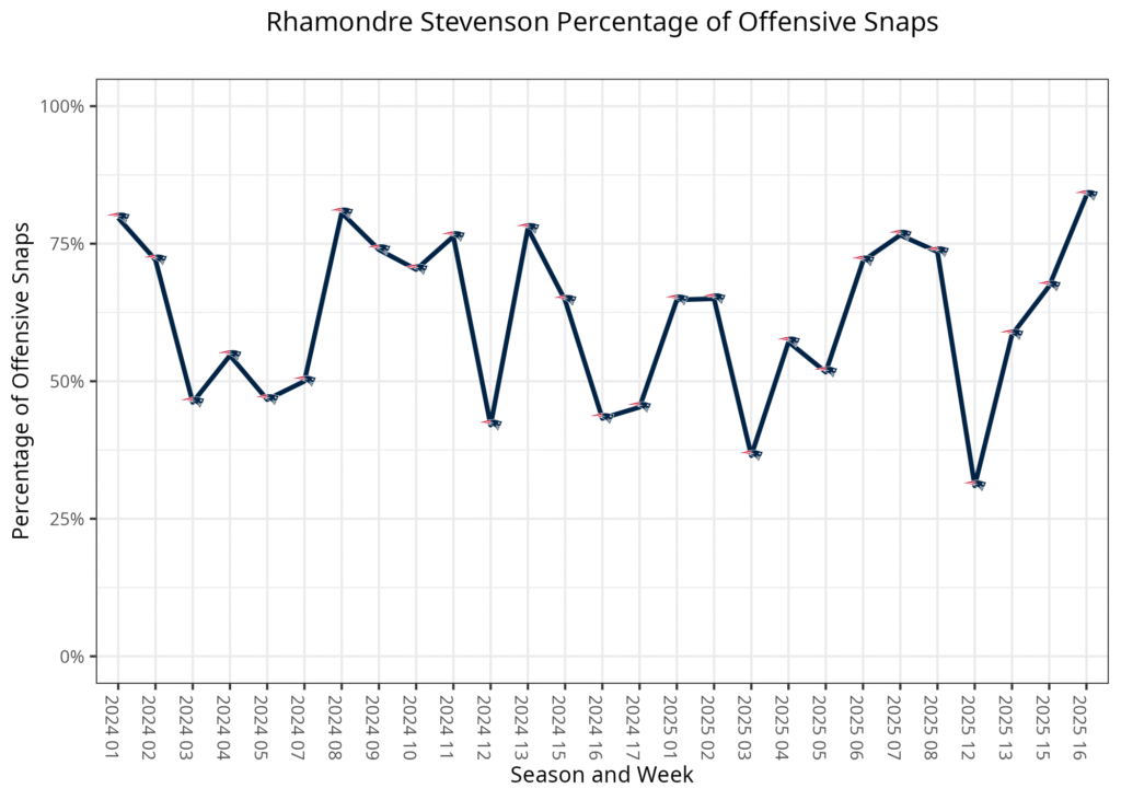 New England had a two-minute drill on their following drive, followed by a three-and-out. New England fell behind after this point and largely abandoned their run game. This meant Stevenson had a relatively quiet day, despite the significant increase in snaps. His one notable play was a 21-yard touchdown run to give New England a lead in the final three minutes.