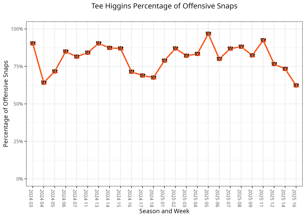He played 36 of a possible 52 snaps in the first three quarters but 28 of a possible 33 pass plays. This left Iosivas playing more than usual in two-receiver sets and Mitchell Tinsley playing more in three-receiver sets. The Bengals had a dominant lead heading into the fourth quarter. They eventually pulled all of their starters, while Higgins joined the other starters in leaving early.